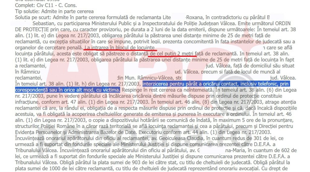 La intrarea în blocul de locuinţe …, Râmnicu-Vâlcea, în care se află locuinţa pârâtului, acesta este obligat să păstreze o distanţă de cel puţin 2 metri faţă de reclamantă. Obligarea pârâtului la păstrarea unei distanţe minime de 25 de metri faţă de locuinţa în fapt a reclamantei, situată în …., jud. Vâlcea, faţă de domiciliul său situat în Râmnicu-Vâlcea, …., jud. Vâlcea, precum şi faţă de locul de muncă al reclamantei, …., din Mun. Râmnicu-Vâlcea, str….jud. Vâlcea. Interzicerea pentru pârât a oricărui contact, inclusiv telefonic, prin corespondenţă sau în orice alt mod, cu victima”, este hotărârea care nu a fost atacată de bărbat.