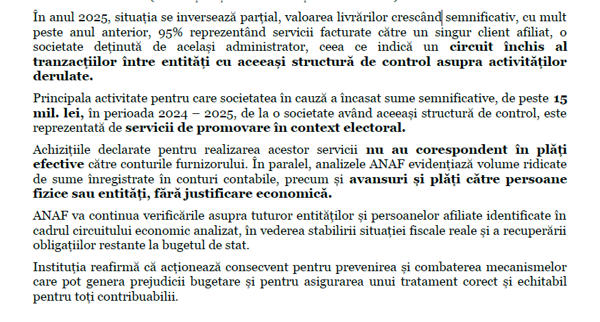 Achizițiile declarate pentru realizarea acestor servicii nu au corespondent în plăți efective către conturile furnizorului. În paralel, analizele ANAF evidențiază volume ridicate de sume înregistrate în conturi contabile, precum și avansuri și plăți către persoane fizice sau entități, fără justificare economică”, se mai menționează într-un comunicat.